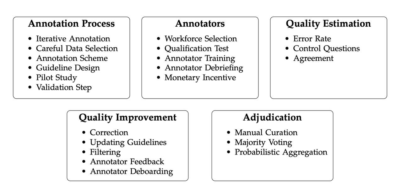 在《Analyzing Dataset Annotation Quality Management in the Wild》等研究中,更进一步将数据质量分解为五个关键构成:Annotation Process(流程)、Annotators(人员)、Quality Estimation(质量评估)、Quality Improvement(持续改进)与 Adjudication(仲裁机制),充分体现了"过程即质量"的理念。