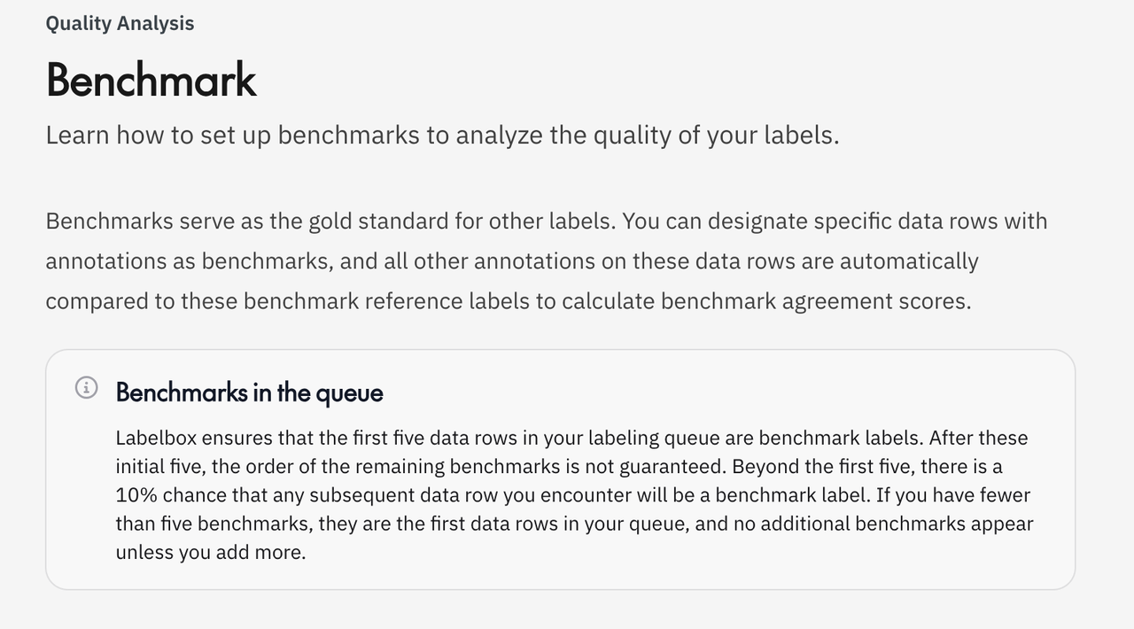 控制任务(Control Tasks):为检测标注员的可靠性和能力水平,系统会随机插入标准答案题目。如果错误率过高,即可暂停该标注员参与。更高级的机制会周期性重复推送相似题目,检测其稳定性和一致性。下例:Labelbox的banchmark label及其插入逻辑