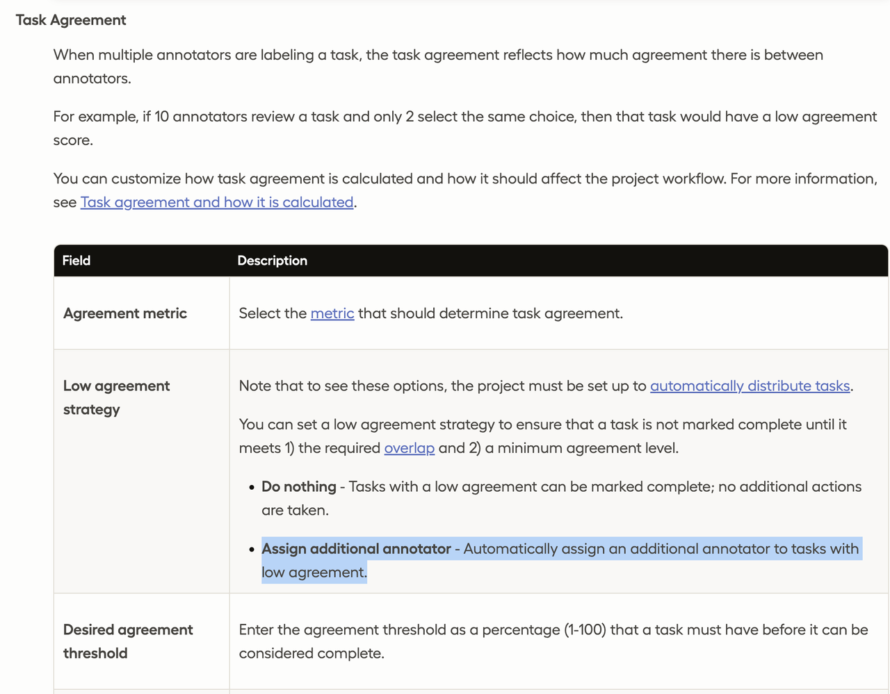 而以label studio为代表实践的则更为复杂,不仅可以拆分人物细节的一致率,还可以将一致率融流程中,为一致率低的任务自动添加更多标注员