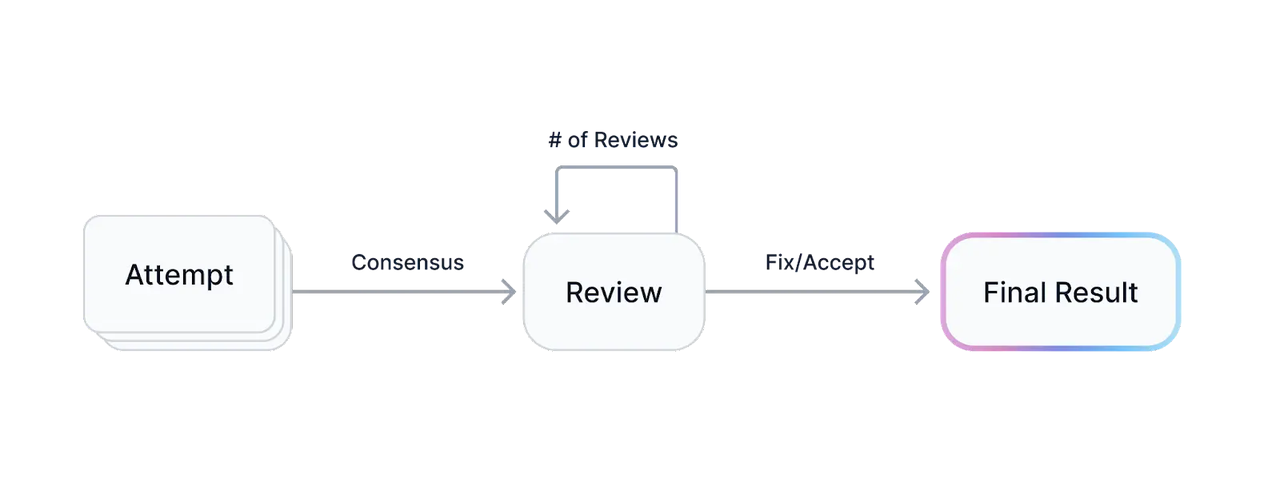 多数投票机制(Majority Vote):对于主观性强的任务,不再盲从"老专家"单一答案,而是引入多位标注员共同投票产生最终答案,避免答案偏向了过时的知识或单点偏见。投票后若标注一致率高,可直接通过;一致率低则进入人工审核。下例中Scale.ai的Consensus Pipeline是majority vote的简单应用