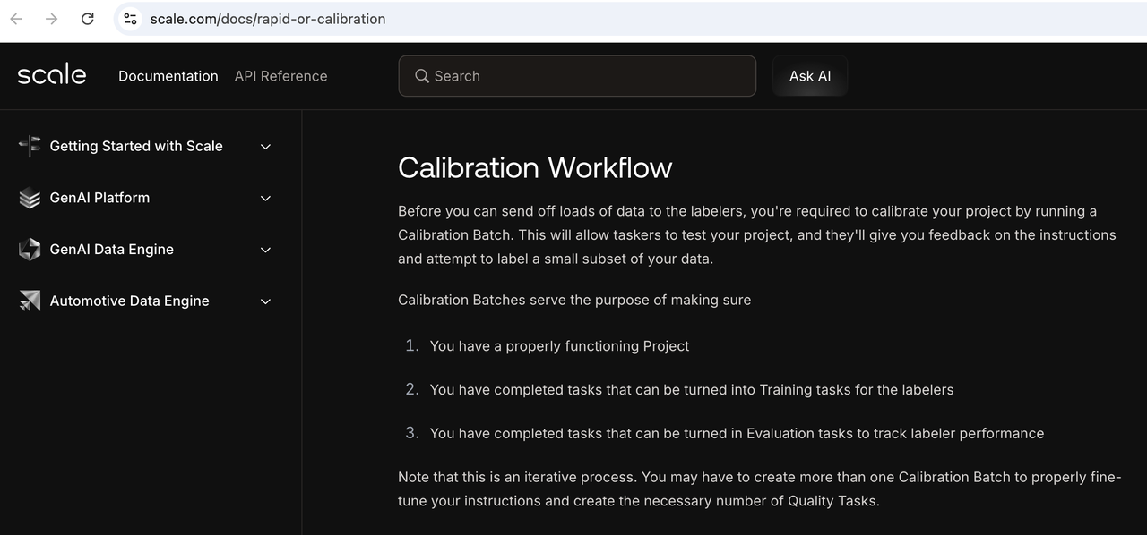 在标注初期,指南模糊、质量标准分歧、标注界面体验欠佳是常态。通过小规模试运行校准流程,反馈修正指引,逐步放量。这与互联网产品中的"小流量A/B实验---优化---规模放量"的思路高度一致。下面以Scale.ai 的 Calibration Workflow为例: